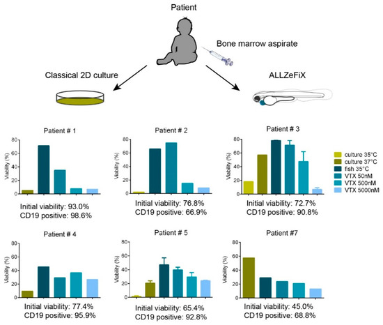 The US Food and Drug Administration approved the BCL2 apoptosis regulator inhibitor, venetoclax, to treat adult patients with chronic lymphoblastic leukemias and acute myeloid leukemia. Venetoclax also recently entered a phase I trial (EudraCT 2017-000439-14, NCT03236857) as either single-agent therapy or in combination with chemotherapy for relapsed/refractory cancers (including BCP-ALL) in pediatric and young adult patients [23]. With the purpose to improve individual targeted treatment approaches, we present the human–zebrafish xenograft (ALL-ZeFiX) assay as a proof-of-concept for in vivo drug response prediction for the test case, venetoclax, from patient-derived leukemic blasts in 5 days.