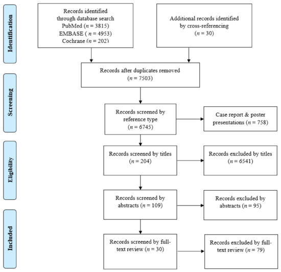 A flow diagram of the literature selection process is presented in Figure 1. In total, 9000 records were identified in the initial search (3815 in PubMed, 4953 in EMBASE, 202 in the Cochrane library) and 30 records were identified by cross-referencing. After excluding 1497 duplicates, a total of 7503 records were screened by the type of reference. After 758 records of case reports and poster presentations were excluded, 6745 records were screened by their titles. After 6541 records were excluded, 204 records were screened by their abstracts. After 95 records were excluded, 109 records were screened by full-text review. After excluding 79 records, only 30 records, covering 40 deep learning models, were deemed eligible for an in-depth review and qualitative and quantitative analyses.