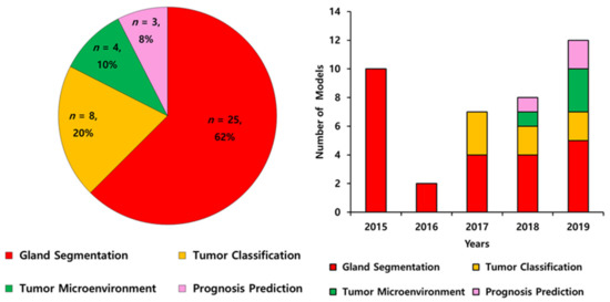 The literature according to the deep learning models applied in colorectal cancer are summarized in Table 1 and Table 2. All 40 included models were published in 30 journal articles between 2015 to 2020 and conducted globally (23 models in Europe, four models in the USA, one model in Canada, one model in Russia, and 11 models in Asian countries). The algorithm features of the models were gland segmentation (n = 25, 62%), tumor classification (n = 8, 20%), tumor microenvironment characterization (n = 4, 10%), and prognosis prediction (n = 3, 8%) (Figure 2A). The number of published models has increased (Figure 2B).