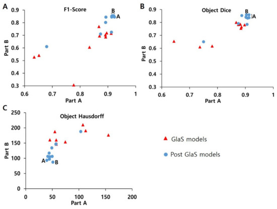 Comparison between (A) F1-score, (B) object Dice, (C) object Hausdorff of GlaS models, and Post-GlaS models. Part A means data used as off-site and Part B data used as on-site and A and B indicate the best model for Parts A and B, respectively. The models by Yan, Yang, and Zhang et al. show the best F1-scores, the models by Yang, Ding, and Graham show the best object Dice, the models by Ding and Manivannan et al. show the best object Hausdorff.
