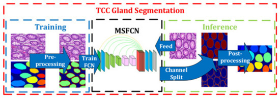 Example of colon cancer segmentation. The flow chart of the three-class classification multi-scale fully convolutional network model. The left side represents the training process and the right side represents the inference. The glands are labeled by different colors at last. Figure 2 in Ding et al. [33]. Reprinted with permission from the authors [33]. Copyright (2019), Neurocomputing published by ELSEVIER.