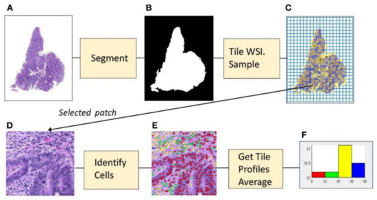 Example of microenvironment analysis from CRC slides. (A) Histopathology image. (B) Foreground mask. (C) Tiling, with sampled patches. (D) Sampled patch. (E) Cells identified by the algorithm. (F) Histogram of cell frequencies. Figure 1 in Shapcott et al. [48], Reprinted with permission from the authors [48]. Copyright (2019), the Frontiers in Bioengineering and Biotechnology published by Frontier.
