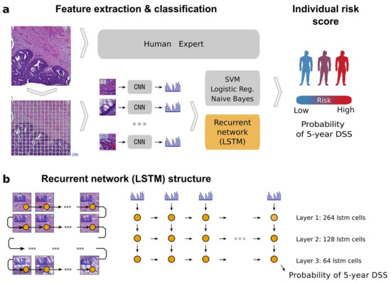 Example of patient prognosis of CRC patients. Overview of the image analysis pipeline and long short-term memory (LSTM) prognostic model. Images of tissue microarray (TMA) spots are characterized by a pre-trained convolutional neural network (VGG-16) in a tile-wise manner. The VGG-16 network produces a high-dimensional feature vector for each tile from an input image. These features then serve as inputs for classifiers trained to predict five-year disease-specific survival (DSS) (a). The long short-term memory (LSTM) network slides through the entire image of the tissue microarray spot to jointly summarize observed image tiles and predict the patient risk score (b). Figure 1 in Bychkov et al. [49], copyright 2018 the author(s), reprinted from the Scientific Reports published by Nature. This is an open access articles under the term of the Creative Commons attribution-Non Commercial-NoDerivs License.