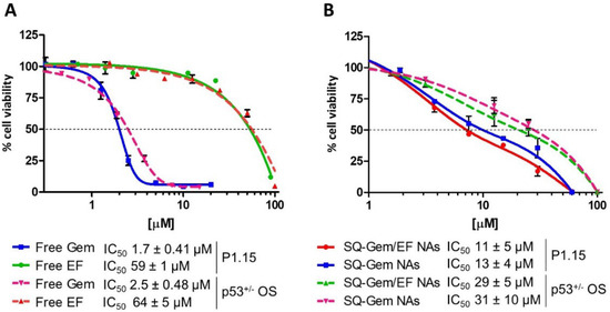 In vitro cytotoxicity representative curves of (A) free Gem versus free EF and (B) SQ–Gem NAs versus SQ–Gem/EF NAs treatments tested on p53+/− OS and P1.15 cells. IC50 values are the mean ± SD of at least three independent determinations.