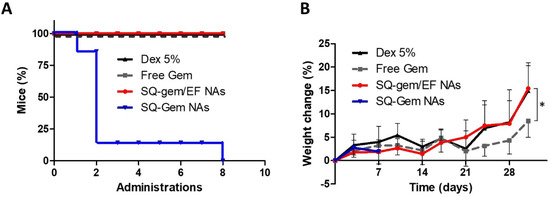 To assess the influence of inserting EF into SQ–Gem NAs, we then investigated the tolerability of the SQ–Gem/EF NAs versus SQ–Gem NAs after multiple administrations in tumor-bearing mice. The doses used in the pharmacokinetic study were reduced from 58 to 38 μmol/kg in order to observe any subacute toxic effects associated with the long-term treatment. SQ–Gem NAs triggered a marked toxicity after the second administration, being lethal for 85% of the mice (Figure 3A). Interestingly, no fatal adverse events were found in the SQ–Gem/EF NAs treatment group during the experiment. Similarly, free Gem and non-treated (Dex 5%) groups did not display any mortality. Of note, no loss in body weight was detected in any of the groups (Figure 3B), confirming that SQ–Gem/EF NAs were well tolerated at least after eight consecutive administrations. Only the mean weight gain of mice receiving free Gem was slowed down from day 21. At day 32, this weight gain difference reached 7%, being statistically significant in comparison with the non-treated and SQ–Gem/EF NAs groups (* p < 0.05).