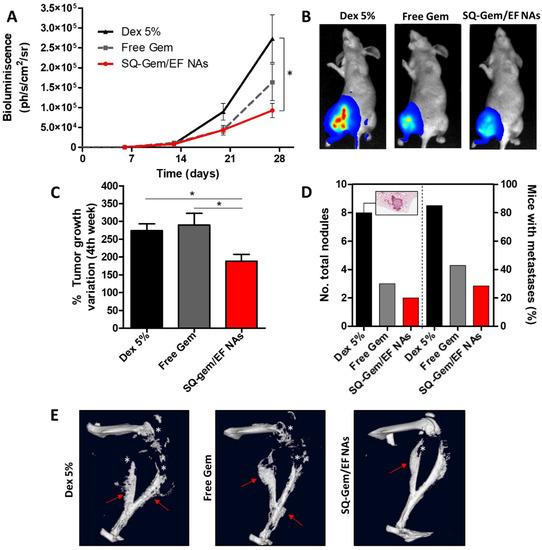 Tumor growth inhibition after multidrug treatment of mice bearing OS cells. All groups received eight intravenous injections in the retro-orbital plexus of either SQ–Gem/EF NAs, free Gem or a Dex 5% solution at the dose of 38 μmol/kg (Eq. to EF, SQ–Gem and Gem). (A) Hindlimb bioluminescence was regularly measured during the experimental period. The values are the mean ± SEM (n = 7) normalized to day 0; (B) representative bioluminescence images of OS bearing mice 27 days after the intratibial inoculation of P1.15 cells; (C) percentage of tumor growth variation measured as hindlimb bioluminescence signal corresponding to the 4th week (days 20 to 27) (n = 7, data = mean ± SEM, * p < 0.05); (D) quantification of the number of total metastatic nodules and the percentage of mice presenting macroscopic lung metastases (n = 7). A representative photomicrograph of a hematoxylin and eosin-stained histological section of lungs of a non-treated tumor-bearing mouse is shown; (E) representative micro-CT 3D images of the tumor-bearing hindlimbs for each treatment group. Red arrows: ectopic bone formation, white asterisks: osteolytic regions.