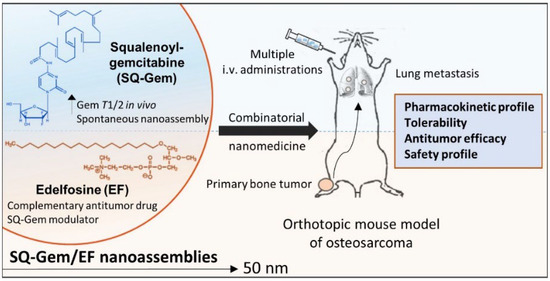 The vast majority of nanotechnology approaches for OS treatment to date rely on the anthracycline doxorubicin as a chemotherapeutic drug model [37]. Only two recent papers report the successful encapsulation of Gem in magnetite nanoparticles [38] and liposomes [39]. In the latter case, Caliskan et al. also proposed the combination of Gem with clofazimine, which is not a DNA disrupter per se like EF. However, to our knowledge this is the first time that a Gem-based nanoformulation (i.e., SQ–Gem/EF NAs) has proven anti-OS potential in vivo. Its safety profile and enhanced efficacy in delaying the primary tumor growth kinetics supports its implementation (for instance) in preoperative neoadjuvant chemotherapy protocols in order to effectively reduce the tumor burden [40].