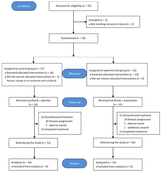 After randomization, 31 patients received at least one dose of the study treatment. The median and mean duration of the treatment in the sorafenib + placebo group were 102.5 days and 177.6 days, respectively. On the other hand, the median and mean treatment durations in the sorafenib + pravastatin group were 286 days and 251.2 days, respectively, while no statistically significant difference between both treatment groups (p = 0.254) was observed. Treatment was interrupted in 25 patients (80.6%) mainly due to disease progression.