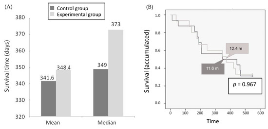 The survival analysis is shown in Figure 2A. The mean survival of the control group was 11.4 months (341.6 days; 95% CI, 249.6–433.7 days) and 11.6 months (348.4 days; 95% CI, 259.3–437.5 days) for the experimental group. On the other hand, the median survival in the control group was of 11.6 months (349.0 days) and in the experimental group of 12.4 months (373.0 days). Overall, there was no significant difference in OS between the two experimental groups (p = 0.967) (Figure 2B).