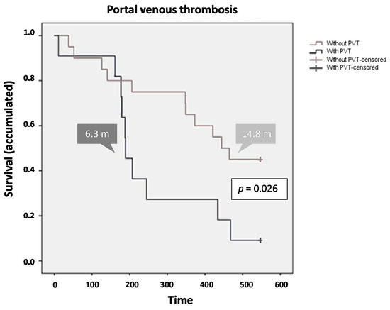 Regarding the factors affecting survival, the presence of PVT and VI had a significant impact on the survival of the total population. A Cox regression analysis showed that PVT remained a strong negative prognostic factor for OS. Patients without PVT showed higher survival values [mean 13.1 months (394.3 days; 95% CI, 316.0–472.6 days), median 14.8 months (444.0 days; 95% CI 347.6–540.4 days)], with an end-of-study survival rate of 45%. In contrast, those patients with PVT [mean 8.5 months (255.1 days; 95% CI, 165.3–345.0 days), median 6.3 months (189.0 days; 95% CI, 158.8–219.2 days)], presented an end-of-study survival percentage of 9% (p = 0.026) (Figure 3). The assigned treatment did not influence in survival in respect to the presence/absence of PVT (p = 0.301).
