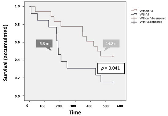 The impact of the presence of VI on survival rates was negative (p = 0.041). Specifically, in comparison with patients without VI, the presence of VI resulted in a decrease in the mean [13.6 months (406.8 ± 38.4 days; 95% CI, 331.5–482.0) vs. 8.6 months (259.2 ± 47.9 days; 95% CI, 165.3–353.2), respectively] and in the median [14.8 months (444 ± 46.7 days; 95% CI, 352.5–535.5) vs. 6.3 months (189 ± 16.8 days; 95% CI, 156.1–221.9), respectively] survival rates. Importantly, a 135% increase in survival was observed for patients without VI, compared to the population with VI (Figure 4).