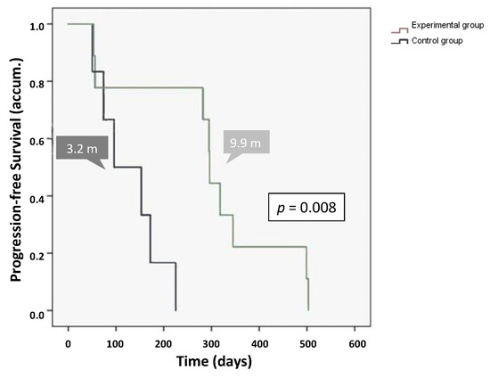 During the study, radiological progression was evident in 15 of the 31 patients. The mean and median radiological TTP in the total population were 7.6 months (227.8 ± 39.3 days; 95% CI, 150.7–304.9 days) and 7.5 months (225 ± 83.1 days; 95% CI, 62.2–387.8 days), respectively. At one-year after initiating the treatment, 58% of patients were free from disease progression. The median TTP was significantly longer in the experimental group [mean 9.8 months (294.1 ± 53.2 days) and median 9.9 months (296 ± 1.5 days)] compared to the control group [mean 4.3 months (128.3 ± 27.1 days) and median 3.2 months (96 ± 48.4 days)] (p = 0.008) (Figure 5).