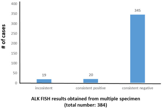 In the tissue FISH database of the Clinical Cytogenetics Laboratory during the time interval of this study, 384 lung cancer patients were tested two or more times for ALK FISH. Nineteen (4.9%) of these patients had tumor samples that exhibited inconsistent intersample ALK FISH results (positive to negative or vice versa). The remaining patients had consistent, i.e., either positive (n = 20, 5.2%) or negative (n = 345, 89.9%), ALK FISH results (Figure 1). The 19 patients with inconsistent results formed the study group.
