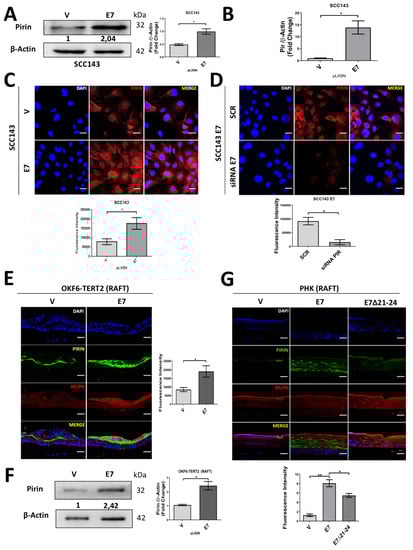 Human papilloma virus (HPV)16 E7 oncoprotein positively regulates the levels of Pirin protein in oral cells and foreskin keratinocytes. (A) Western blot to evaluate Pirin protein levels in SCC143/E7 and SCC143/V cells using β-actin as a loading control. The graphs represent a densitometric analysis of three independent Western blots for each protein normalized by β-actin. (B) RT-qPCR was performed for the normalized PIR transcript with the β-actin transcript. (C) Indirect immunofluorescence (IFI) reveals an increase in Pirin levels in SCC143/E7 cells. Scale bar: 10 µm. (D) IFI performed on SCC143/E7 cells previously transfected with control siRNA (SCR) and E7 siRNA to evaluate Pirin protein. Scale bar: 10 µm. (E) IFI performed on OKF6/TERT2 V and E7 oral organotypic raft culture cells to evaluate Pirin protein. Scale bar: 35 µm. (F) Western blot to evaluate Pirin protein levels in organotypic raft cultures established from OKF6/TERT2 V and OKF6/TERT2 E7 oral cells. (G) IFI performed in human foreskin keratinocytes (HFK)-expressing E7, E7Δ21-24 and the control with the empty vector; graph represents fluorescence analysis. Scale bar: 35 µm. Data are presented as the mean ± standard error of the mean (SEM); average of three independent experiments, conducted in triplicate. * p < 0.05 and ** p < 0.01 (Mann–Whitney test). Rhodamine Phalloidin (Rh/Ph).