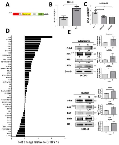HPV16 HPV E7 promotes nuclear factor kappa-light-chain-enhancer of activated B cell (NF-κB) activation in oral cells. (A) pHAGE/NF-κB reporter vector map. (B) Luciferase activity normalized with GFP was evaluated in SCC143/E7 and SCC143/V cells transfected with the reporter vector pHAGE/NF-κB. (C) Luciferase activity normalized with GFP in SCC143/E7 cells co-transfected with pHAGE/NF-κB and siRNA for PIR or siRNA E7 knockdown and siRNA (SCR) as a control. (D) Protein array of NF-κB signaling pathway comparing the SCC143/V and SCC143/E7 cell extracts. Data were plotted in reference to the change that occurred in the presence of E7 compared to the empty vector control. (E) Western blot of nuclear and cytoplasmic protein fractions was performed to analyze the levels of Pirin, p65S529, p65, and C-Rel. β-actin or H3 were used as a load control in SCC143 cells transduced with empty (pLXSN) or E7 constructs. The graphs represent a densitometric analysis of three independent Western blots (WBs) for each protein normalized against β-actin. Data are presented as the mean ± SEM; average of three independent experiments, conducted in triplicate. * p < 0.05 (Mann–Whitney test).