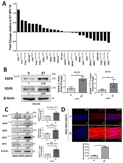 HPV16 HPV E7 protein induces EGFR/PI3K/AKT signaling. (A) Protein array of the MAPK and AKT pathways comparing the SCC143/V and SCC143/E7 cell extracts. Data were plotted in reference to the change that occurred in the presence of E7 compared to the empty vector control. (B) Western blot performed to check the levels of total EGFR, pEGFRY1173 and β-actin used as load control in SSC143/E7 and SSC143/V cells. The graphs represent a densitometric analysis of three independent assays. (C). WBs were performed with protein extracts from OKF6-TERT2 cell organotypic cultures, the levels of total EGFR, pEGFRY1173, pEGFRY1068, AKT1, pAKT1S473, pRb, Pirin and β-actin, used as load controls, were analyzed. (D) IFI reveals an increase in AKT1S473 in OKF6-TERT2 E7 organotypic cultures. The graph represents the fluorescence analysis. Scale bar: 15 µm. Data are presented as the mean ± SEM; average of three independent experiments, conducted in triplicate. * p < 0.05 (Mann–Whitney test).