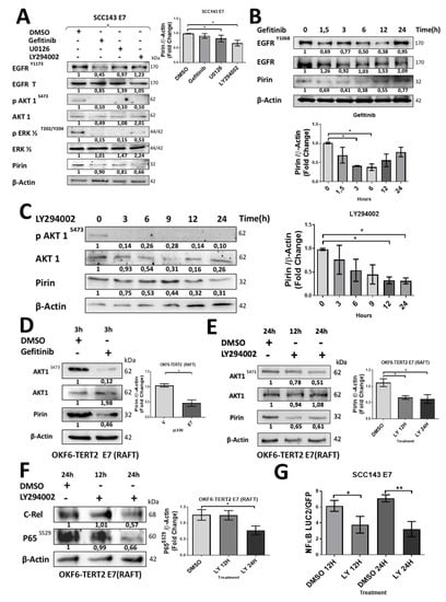 HPV16 HPV E7 induces EGFR/PI3K/AKT1 signaling for PIR/NF-kB activation in oral cells. (A) Western blot was performed with protein extracts from SCC143/E7 cells previously exposed to Gefitinib (EGFR), U0126 (ERK) and LY294002 (PI3K) inhibitors for 24 h. The levels of total EGFR, pEGFRY1173, AKT1, pAKT1, ERK, pERK, Pirin and β-actin used as load control were analyzed. The graphs represent a densitometric analysis of three independent WBs for Pirin normalized against β-actin. (B) Time–response assay by exposure to Gefitinib for 1.5 to 24 h in SCC143/E7 cells. The levels of total EGFR, pEGFRY1068, Pirin and β-actin used as load control were analyzed. The graph represents a densitometric analysis of three independent experiments. (C) Time–response assay by exposure to 10 µM LY294002 for 3 to 24 h in SCC143/E7 cells. The levels of total AKT1, pAKT1, Pirin and β-actin used as load control were analyzed. The graph represents densitometric analysis of three independent experiments. (D) Western blot to evaluate AKT1, pAKT1, Pirin protein levels in organotypic raft cultures established from OKF6/TERT2 E7 oral cells treated with dimethyl sulfoxide (DMSO) or Gefitinib for 3 h (β-actin used as load control were analyzed). (E) Western blot to evaluate AKT1, pAKT1, Pirin protein levels in OKF6/TERT2 E7 oral organotypic raft culture cells treated with DMSO or 10 µM LY294002 for 12 or 24 h (β-actin used as load control were analyzed). (F) Western blot to evaluate c-Rel and p65S529 protein levels in organotypic raft cultures established from OKF6/TERT2 E7 oral cells treated with DMSO or 10 µM LY294002 for 12 or 24 h (β-actin used as load control were analyzed) (G) Luciferase activity normalized against GFP was evaluated in SCC143/E7 cells transfected with the reporter vector pHAGE/NF-κB treated with DMSO or 10 µM LY294002 for 12 or 24 h. Data are presented as the mean ± SEM; average of three independent experiments, conducted in triplicate. * p < 0.05 and ** p < 0.01 (ANOVA test). LY294002 (LY).