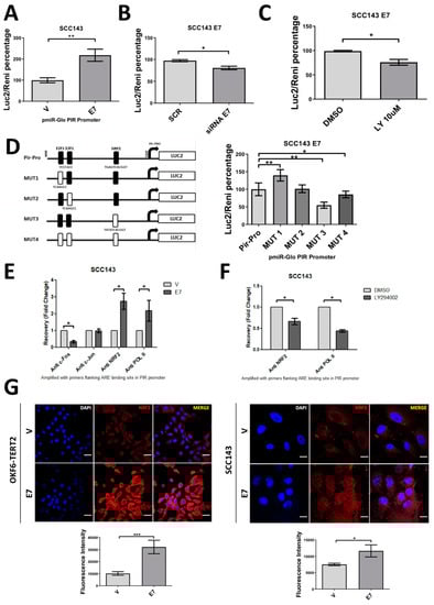 In order to evaluate the E7-dependant transcriptional activation of PIR, we developed a construct in which the PIR promoter (−341 nt to +559 nt) was inserted upstream of the firefly luciferase reporter gene (luc2) open reading frame (pmiR-GLO/pPIR). After cell transfection with the pmiR-GLO/pPIR construct, we observed that SCC143/E7 cells showed a significant increase in luciferase activity when compared with SCC143/V cells (Figure 5A). Moreover, by using an interfering RNA for E7 knockdown or LY294002 inhibitor for 12 h, we observed a significant decrease in luciferase activity, suggesting that E7 and PI3K/AKT are involved in transcriptional activation of the PIR gene promoter (Figure 5B,C). To determine relevant transcription factors potentially involved in the E7-mediated PIR promoter activation, four mutants in the PIR promoter region were synthesized by using the PROMO 3.0 software. Considering that the E2F family of factors are released by E7-induced degradation of pRb and NRF2 is involved in the regulation of PIR transcript levels [30], we constructed E2F1- and NRF2 (antioxidant response elements (ARE))-binding site mutants in the PIR promoter, as shown in Figure 5D. We verified that the ARE site allowing NRF2 binding is relevant for inducing E7-mediated PIR promoter activation (Figure 5D, right). Then, establishing, in a timely manner, that the NRF2 factor is responsible for increasing PIR promoter activity, a chromatin immunoprecipitation (ChIP) assay was performed. We analyzed the c-Jun and c-Fos proteins components of the AP1 transcription factor, since there is a 12-O-tetradecanoilphorbol-13-acetate (TPA) response element (TRE) site very close to the ARE site. In addition, AP1 is a recognized transcription factor potentially regulated by the PI3K/AKT pathway. Accordingly, ChIP test results showed that the recruitment of NRF2/RNA Pol II into the PIR promoter in the presence of E7 is increased approximately 3.5-fold in respect to the control. In addition, c-Jun and c-Fos were not significantly recruited into the PIR promoter in the presence of E7 (Figure 5E). Moreover, a decrease in the recruitment of NRF2/RNA Pol II in the PIR promoter was shown when the cells were incubated with LY294002 inhibitor for 24 h (Figure 5F). Finally, a significant increase in NRF2 levels was observed in OKF6-TERT2 and SCC143 cells expressing E7 (Figure 5G). Taken together, these data demonstrate that HPV16 E7 oncoprotein promotes NRF2 transcription factor recruitment to the ARE site into the PIR promoter in oral cancer cells.