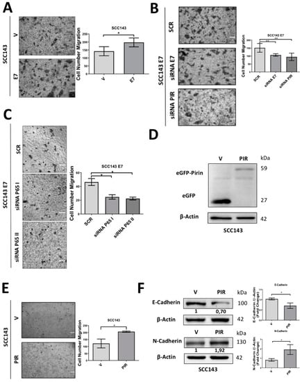 HPV16 E7 expression and PIR induces migration of oral cells. (A) A migration assay in SCC143/E7 and SCC143/V cells was carried out for 7 h using fibronectin pretreated transwells, scale bar 25 µm. (B) A migration assay performed on SCC143/E7 cells previously transfected with control siRNA (SCR), siRNA PIR or HPV16 siRNA E7 was carried out for 7 h using fibronectin pretreated transwells, scale bar 25 µm. (C) A migration assay performed on SCC143/E7 cells previously transfected with control siRNA (SCR) and siRNA I-II p65 was carried out for 7 h using fibronectin pretreated transwells, scale bar 25 µm. (D) Western blot against eGFP performed for V corresponding to the empty vector (pcDNA 3.1–eGFP) and PIR corresponding to the vector containing the PIR sequence linked to eGFP (pcDNA 3.1–eGFP–PIR) transfected in SCC143 oral cell. (E) A migration assay in SCC143 V (pcDNA 3.1–eGFP) and SCC143 PIR (pcDNA 3.1–eGFP–PIR) cells was carried out for 7 h using fibronectin pretreated transwells. Scale bar: 40 µm. (F) Analysis of E-cadherin and N-cadherin protein levels, which were normalized with the expression of β-actin. The graphs represent a densitometric analysis of three independent assays. Data are presented as the mean ± SEM; average of three independent experiments, conducted in triplicate. * p < 0.05 and ** p < 0.01 (Mann–Whitney test).