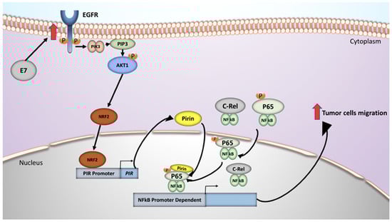 Previously, we reported that HPV16 E7 is involved in Pirin (encoded by PIR gene) overexpression, which is an OS sensor and activator of nuclear factor kappa-light-chain-enhancer of activated B cells (NF-κB) [21]. Upon NF-κB activation, Pirin increases epithelial–mesenchymal transition (EMT) and cell migration in HeLa, a HR-HPV positive cell line [22]. The NF-κB pathway is composed of homo or heterodimers of five proteins belonging to the REL oncogene family, these proteins being p50 (NF-κB1), p52 (NF-κB2), p65 (Rel A), Rel B and c-Rel [23]. Accordingly, the NF-κB pathway is recognized by its key role in inflammation and innate immune response, plus, it is related with tumor progression and increased cell migration [24]. However, conflicting data are found regarding the role of HR-HPV and viral oncogenes in NF-κB activation. Moreover, although factors involved in a such differences are unclear [25,26,27], it seems that NF-κB is activated in a cell type-dependent manner [28]. Here, we addressed the role of signaling pathways involved in HPV16 E7-mediated PIR/NF-κB activation and oral cell migration, finding that HPV16 E7 promotes the activation of the EGFR/PI3K/AKT/NRF2 signaling pathway, in turn stimulating PIR-mediated NF-κB activation in oral cancer cells.