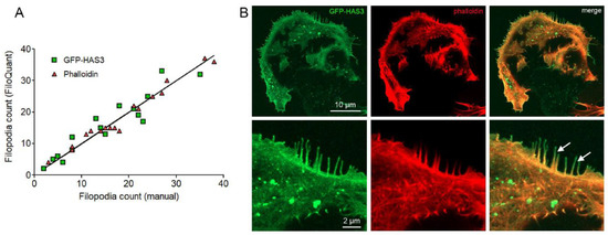 Precision in filopodia detection with EGFP-HAS3 and phalloidin signal in fixed cells. (A) The amount of filopodia detected with FiloQuant analysis is plotted against the manually annotated filopodia number for each cell edge by using EGFP-HAS3 signal (green squares, R2 = 0.8964) and phalloidin signal (red inverted triangles, R2 = 0.9717). (B) Images illustrating EGFP-HAS3 signal and phalloidin signal; arrows in (B) point filopodia in the edge of MCF-7 cell expressing GFP-HAS3 (n = 16 cells for both groups).