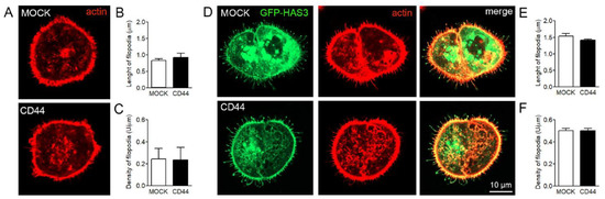 To study the effect of hyaluronan receptor CD44 on filopodial growth, two versions of human gastric cancer cell line MKN74, MOCK (CD44-negative) and CD44 (CD44 overexpression), were utilized (Figure 6A). The characterization of hyaluronan metabolism of MKN74 has shown that CD44 overexpression induces binding of hyaluronan to the plasma membrane, especially around filopodia [22]. However, the level of secreted hyaluronan was slightly higher in MOCK cells, the average amount being 2.5 ng/10,000 cells, while CD44+ cells produced 1.9 ng/10,000 cells of hyaluronan during 24 h [22]. The FiloQuant analysis showed no significant difference in length (Figure 6B) or density (Figure 6C) of filopodia between the two cell lines. Further, to find out whether CD44 is required for the formation of HAS3-induced filopodia, both MOCK and CD44+ MKN74 cell lines were transiently transfected with GFP-HAS3 construct (Figure 6D). Both cell lines were able to form filopodia with high accumulation of GFP-HAS3 in filopodia and their tips (Figure 6D). Analysis of phalloidin staining showed that HAS3 expression induced the average length (Figure 6B,E) and density (Figure 6C,F) of filopodia in both cell lines, but no difference either in average length (Figure 6E) or density (Figure 6F) of filopodia between CD44 negative and CD44 expressing cells was detected.