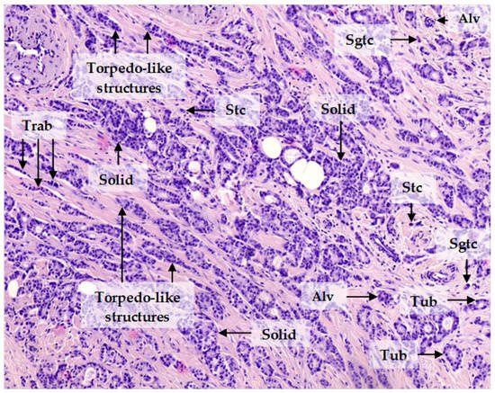 Invasive breast carcinoma of no special type. The invasive component of the tumor is heterogeneous and represented by tubular (Tub), alveolar (Alv), solid, trabecular (Trab), and torpedo-like structures, as well as discrete groups of tumor cells including small groups of two to five tumor cells (Sgtc) and single tumor cells (Stc). Hematoxylin and eosin staining, 200× magnification.