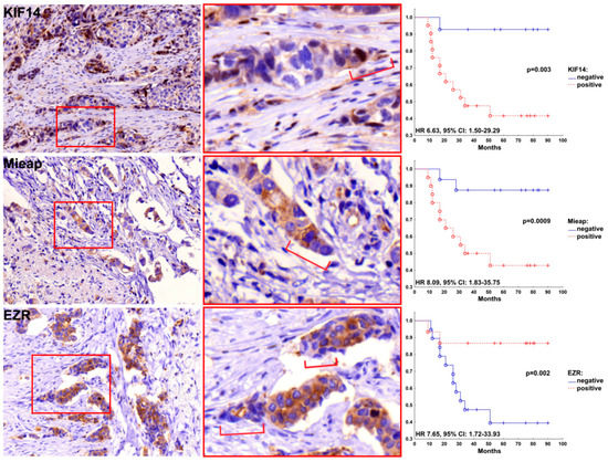The representative images of IHC staining for KIF14, Mieap, and EZR proteins are provided in Figures S2–S4. In total, positive expression of KIF14 and Mieap and negative expression of EZR were observed in 58.4 (45/77), 45.4% (35/77), and 59.2% (45/76) of breast cancers, respectively. Positive expression of KIF14 and Mieap and negative expression of EZR were more often observed in trabecular (74.3–91.7%) and tubular structures (62.5–88.2%) as compared to other structures and single tumor cells (39.1–60.0%; p < 0.05; Tables S4–S6).