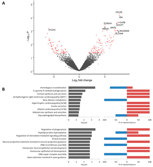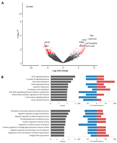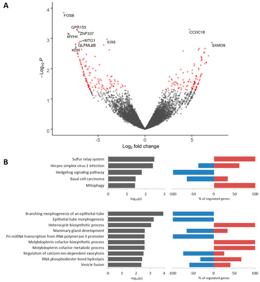 Differential expression analysis of EZR-negative tumor cells. Volcano plot of TOP 10 up- and downregulated genes (A). TOP 10 KEGG signaling pathways and GO biological processes (B). Up- and downregulated genes with an unadjusted p-value < 0.05 were used for functional enrichment analysis. The left panel shows –log10p of the perturbation determined from a gene set test, whereas the right panel demonstrates a percentage of genes from corresponding KEGG and GO nodes that are down- and upregulated.