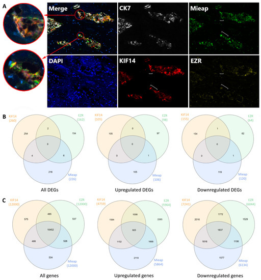 It turned out that positive expression of KIF14 and Mieap and negative expression of EZR were mainly observed in torpedo-like structures of the same breast tumors. Simultaneous expression of all three proteins was observed in 57.9% (11/19) of the patients with metastases. The co-expression of any two proteins was detected in 15.8% (3/19) of the cases (Table S16). Multiplex IHC staining demonstrated that KIF14 and Mieap positive expression and EZR negative expression were both observed in the same cells and were specific for different cells within the tips of the torpedo-like structures (Figure 6A). Nevertheless, RNA-sequencing showed no overlapping DEGs (p < 0.05) between KIF14-positive, Mieap-positive, and EZR-negative cells (Figure 6B). Low overlapping was found when all genes up- and downregulated in KIF14-positive, Mieap-positive, and EZR-negative cells were analyzed (Figure 6C).