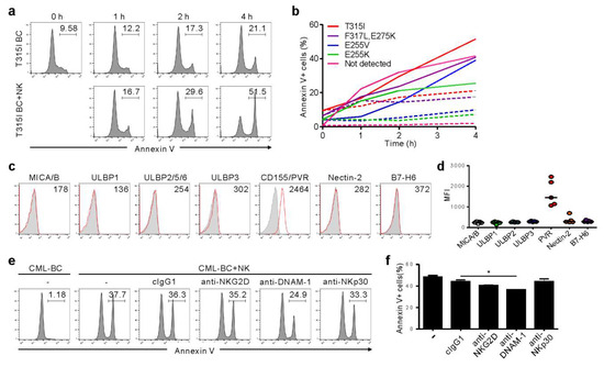 - Boissel, N.; Rea, D.; Tieng, V.; Dulphy, N.; Brun, M.; Cayuela, J.-M.; Rousselot, P.; Tamouza, R.; Le Bouteiller, P.; Mahon, F.-X.; et al. BCR/ABL Oncogene Directly Controls MHC Class I Chain-Related Molecule A Expression in Chronic Myelogenous Leukemia. J. Immunol. 2006, 176, 5108–5116. [Google Scholar] [CrossRef] [PubMed]