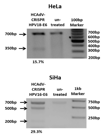 To prove CRISPR-mediated mutation induction at the target sites of the respective gRNAs, HeLa and SiHa cells were transduced with HPV18-E6 specific CRISPR-HCAdV or HPV16-E6 specific CRISPR-HCAdV, respectively. Then, 48 h post-transduction, genomic DNA of HPV18-E6-specific CRISPR-HCAdV-treated HeLa cells and HPV16-E6-specific CRISPR-HCAdV-treated SiHa cells was isolated for mutation detection. HPV-E6 loci surrounding the respective gRNA target sites were amplified by PCR. Resulting PCR amplicons were then subjected to hetero-duplex formation and digested with T7 endonuclease 1. Specific cleavage products of the expected size were detected for HPV18-E6 and HPV16-E6 respectively indicating successful mutation induction at the predicted target sites (Figure 2).