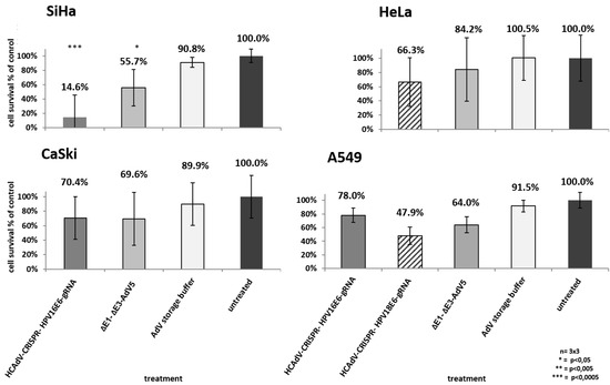 Monitoring of cell survival in SiHa, HeLa, CaSki, and A549 cells. Cells were transduced at confluency with HPV-E6-specific CRISPR/Cas9-HCAdV or ΔE1-ΔE3-AdV5 with 1000 infectious vector particles per cell. Cell viability was measured using a CCK-8 assay five days post-transduction. HPV-positive tumor cells showed reduced viability compared to untreated controls. Standard deviations of mean values are shown as error bars. Statistically significant differences compared to untreated controls are shown as one, two, or three stars indicating p values < 0.05, <0.005, and <0.0005 respectively.