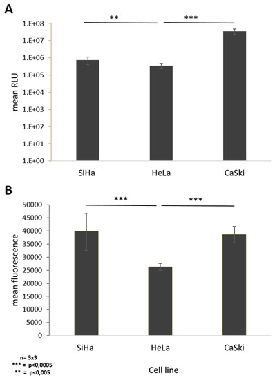 Monitoring cell susceptibility of SiHa, HeLa, and CaSki cells to AdV5. Siha, HeLa, and Caski cells were infected with E3-deleted AdV5-expressing GFP and luciferase at different doses. (A) AdV5 mediated luminescence 24 h post transduction with 20 viral particles per cell (vpc). (B) AdV 5 mediated fluorescence 48 h post transduction with 1000 vpc. Standard deviations of mean values are shown as error bars. The line above the columns indicate which sampled were compared to each other Statistically significant differences of the cell lines compared to each other are shown as two or three stars, indicating p values < 0.005, and 0.0005 respectively.