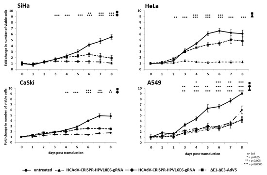 To investigate whether HPV-E6 specific CRISPR-HCAdV can reduce proliferation of HPV-induced cervical cancer cells, we transduced HPV18 containing HeLa cells, HPV16-positive SiHa and CaSki and SiHa cervical cancer cells as well as HPV-negative A459 lung carcinoma cells. We applied the vectors HPV18-E6 specific CRISPR-HCAdV, HPV16-E6 specific CRISPR-HCAdV or ΔE1-ΔE3-AdV5 at MOI 1000 and monitored the increase of viable cells for eight days. Transduction with HPV16-E6-specific CRISPR-HCAdV inhibited cell proliferation of SiHa cells and the number of viable cells significantly differed from untreated controls already three days post-transduction. In contrast, transduction with ΔE1-ΔE3-AdV5 only led to a significant reduction of cell proliferation that was significantly different from untreated controls after day 6 (Figure 5). Transduction with HPV16-E6 specific CRISPR-HCAdV inhibited cell proliferation of CaSki cells and the number of viable cells was significantly reduced compared to untreated controls already four days post-transduction. Transduction with ΔE1-ΔE3-AdV5 also resulted in a significant reduction of cell proliferation that was significantly different from untreated controls after day 6 (Figure 5). Transduction with HPV18-E6 specific CRISPR-HCAdV strongly inhibited cell proliferation of HeLa cells, which was in sharp contrast to untreated controls already three days post-transduction. Transduction with ΔE1-ΔE3-AdV5 resulted in a less pronounced reduction of cell proliferation that was still significantly different from untreated controls between days 4–6 (Figure 5).