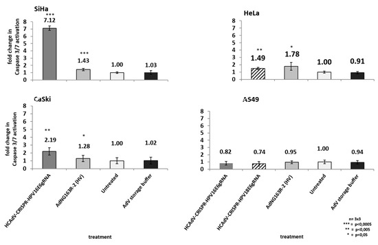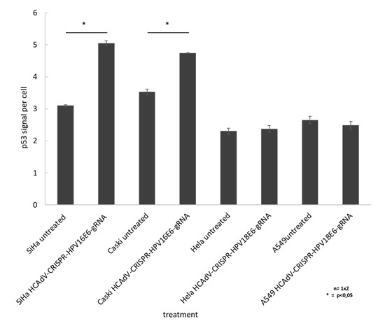 Compared to the CRISPR-expressing HCAdVs, ΔE1-ΔE3-AdV5 showed slightly stronger inhibitory effects on cell viability. However, HPV-specific CRISPR/Cas9-expressing HCAdV led to much stronger Caspase 3/7 induction in HPV-positive cells. However, in A549, no significant induction of apoptosis was observed, indicating that the inhibitory effects on viability and proliferation of HPV positive cells were specific to the CRISPR/Cas9-mediated E6 disruption and induction of apoptosis. Previous studies have shown that transfection of HPV-positive cervical cancer cells with HPV-specific CRISPR/Cas9 expression plasmids lead to increased p53 levels [26,30]. Following adenoviral delivery of HPV specific CRISPR/Cas9 we also observed an increase in p53 levels (Figure 6), indicating that the elimination of HPV oncogenes leads to a re-accumulation or less p53 degradation, which explains the higher number of cells that showed increased Caspase 3/7 activity upon vector treatment (Figure 7).