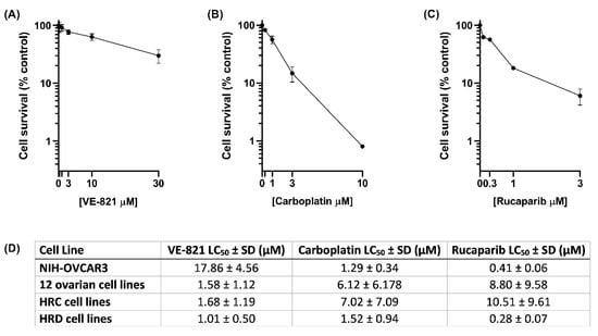 Originating from a tumour clinically refractive to cyclophosphamide, cisplatin and doxorubicin, in original publications the NIH-OVCAR3 cells were reported to be platinum resistant [,]. However, more recent studies such as Beaufort et al., 2014 [] and the GDSC database (https://www.cancerrxgene.org/) highlight conflicting results. We found NIH-OVCAR3 cells were 5-fold more sensitive to carboplatin than the 12 ovarian cancer cell lines (Figure 2B,D), which was comparable to the ovarian cancer cells with homozygous mutations in BRCA1. NIH-OVCAR3 cells were also 4-fold more sensitive to cisplatin (LC50 0.18 µM) compared to 2 representative ovarian cancer cell lines (IGROV1 and CAOV3) in the panel (mean LC50 0.70 µM) (Table S1 and Figure S1) confirming the platinum sensitivity of NIH-OVCAR3.