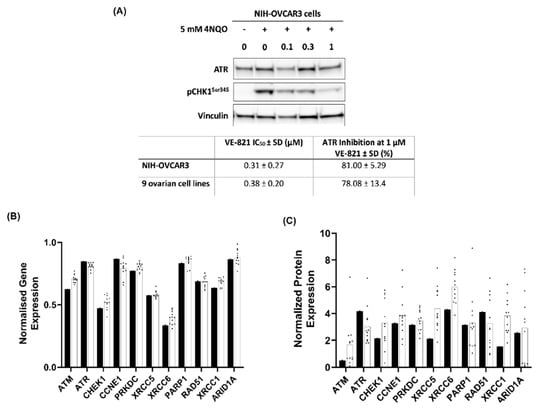 Inhibition of ATR by VE-821 and the expression of potential determinants of sensitivity and resistance to VE-821 in the NIH-OVCAR3 cells. (A) NIH-OVCAR3 cells and 9 other ovarian cancer cell lines were exposed to 4NQO ± VE-821 as indicated for 1 hr before western blotting. Chemiluminescence was quantified using Syngene software and expression of pCHK1Ser345 was normalised to vinculin expression. Western blot image is from a single representative experiment with pooled data from 3 independent experiments per cell line used to calculate the mean VE-821 IC50 and percentage inhibition at 1 µM VE-821. (B) Bar chart represents log-transformed read counts obtained from RNA-Seq data for each gene normalized to ACTB mRNA expression for NIH-OVCAR3 cells (black bars) and the mean mRNA expression of each gene across 12 cell lines (white bars) where each black dot represents one cell line. (C) Bar chart represents protein expression normalised to Ponceau-s staining calculated using ImageJ software in NIH-OVCAR3 cells (black bars) and the mean protein expression of each gene across 12 cell lines (white bars) where each black dot represents one cell line. Data are from a single experimental repeat. [PRKDC: DNA-PKcs, XRCC5: Ku80, XRCC6: Ku70]. Western blot of ATR activation and inhibition by 4NQO ± VE-821 in NIH-OVCAR3 cells can be found at Figure S4. Western blot of baseline protein expression in panel of ovarian cancer cell lines can be found at Figure S5.
