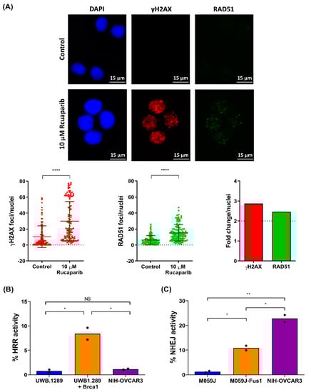 HRR was assessed by immunofluorescence. Cells were treated for 48 h with 10 μM rucaparib with 0.5% DMSO concentration for the untreated and treated cells. To assess DNA damage and functional repair, cells were stained with mouse monoclonal anti phospho-histone H2A.X (Ser139: γH2AX) antibody (Upstate/Millipore, Burlington, NJ, USA) at 1:1000 and rabbit monoclonal anti RAD51 antibody (AbCam, Cambridge, UK) at 1:500. Secondary antibodies used were Alexa 488 conjugated goat anti-rabbit and Alexa 546 conjugated goat anti-mouse (Invitrogen, Waltham, MA, USA), both at 1:1000. The nuclei were stained with DAPI. The number of γH2AX and RAD51 foci in each cell was quantified using ImageJ software and data was plotted using GraphPad Prism (GraphPad, San Diego, CA, USA). A >2-fold increase in γH2AX foci formation was used as an indicator of DNA damage induction following rucaparib treatment and a >2-fold increase in RAD51 foci formation was indicative of functional HRR.
