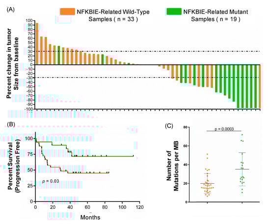 To further understand the clinical and genomic impact of mutations in the NFKBIE-related genes, mutational burden, tumor volume, and patient survival were analyzed (Figure 2). Patients that respond to immunotherapy have been shown to have a higher mutational burden [5]. Our study confirmed those results (Figure S2) while also showing that patients with a mutation in NFKBIE-related genes have a higher mutational burden (Figure 2C, p = 0.003). The percent change of each patient’s sample was calculated from baseline. As demonstrated in the waterfall plot in Figure 2A, 84% (16/19) patients with a mutation in the NFKBIE-related genes had a decreased tumor volume after immunotherapy treatment. Of these 16 patients, 14 demonstrated a decreased tumor volume of over 30% (Figure 2A). Patients with NFKBIE-related gene mutations in addition to decreased tumor volume also demonstrated a significant increase in progression free survival (Figure 2B, p = 0.03). These data establish that patients with NFKBIE mutations have an overall higher mutational burden, decreased tumor volume, and a statistically significant increase in survival.