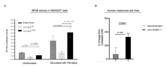 In vitro experiments to assess the effect of NFKBIE G34E on the NFKB pathway. Functional analysis of the NFKBIE G34E variant and wildtype was performed. Cells were stimulated with TNFalpha and monitored for NFkB activity via luciferase reporter assay or protein expression of CD83 by flow cytometry. (A) HEK293T cells were transiently transfected with a luciferase-based NFkB reporter, then either: empty vector or plasmids containing the NFKBIE G34E or NFKBIE wildtype cDNA sequences. Under TNFalpha stimulation, NFKBIE G34E transfected cells displayed an increase in luciferase activity when compared to cells transfected with empty vector (p = 0.001), and wildtype transfected cells (p = 4.9 × 10−9). When cultured without TNFalpha, transfected cells exhibited a decrease in luciferase activity. Values were normalized to empty vector in unstimulated conditions. (B) Flow cytometry analysis for CD83 in human melanoma cell lines that are NFKBIE wildtype and NFKBIE G34E mutant (SKMel28 and A375, respectively). Data are represented as the percent change in protein expression as compared to unstimulated cells. When stimulated, the A375 cell line showed a greater increase in CD83 protein expression as compared to SkMel28 (p = 0.03). For panels (A,B) all p-values were calculated using an un-paired t-test with Holm–Sidak correction for multiple tests. Data represent the standard deviation of the mean. The experiments were performed in technical triplicates, and independently repeated three times.