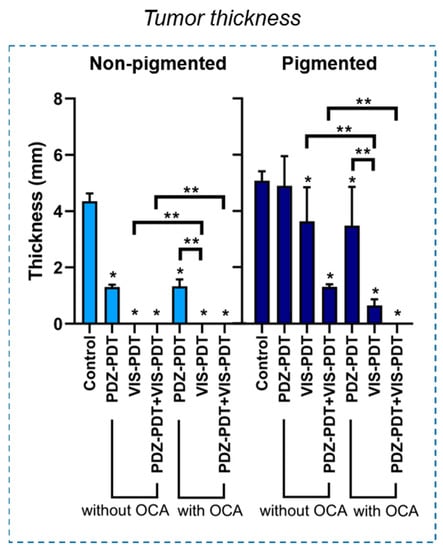 | OCA+(PDZ-PDT+VIS-PDT) | −0.27 ± 0.001 * | −2.58 ± 0.001 | −0.24 ± 0.01 ** | −2.92 ± 0.46 |