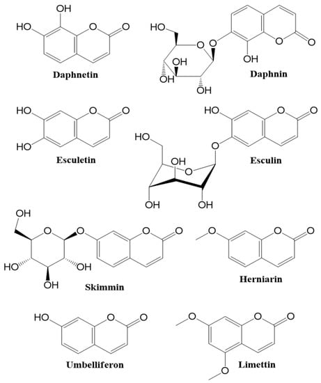 Simple coumarins: these are composed of hydroxylated, alkoxylated and alkylated derivatives of coumarin and their glycosides (e.g., Umbelliferone, skimmin, limettin, herniarin, esculetin, esculin, daphnetin and daphnin (Figure 1)) [].