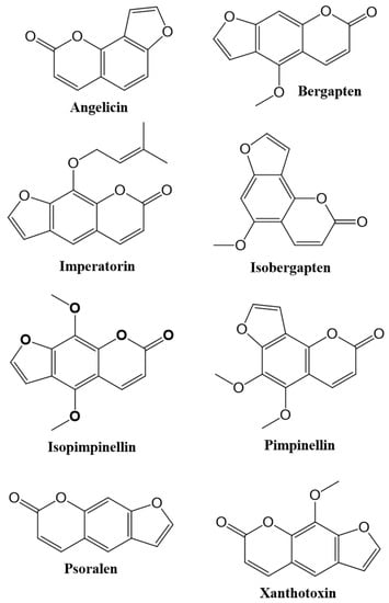 Furanocoumarins: This group of coumarins consists of a furan ring fused with a coumarin. They are divided into two groups as C6/C7 (linear) type, C7/C8 (angular) type according to the attachment place of the furan ring. (e.g., psoralen, xanthotoxin, bergapten, imperatorin, isopimpinellin, anjelisin, isobergapten and pimpinellin (Figure 2)) [,,,,,].