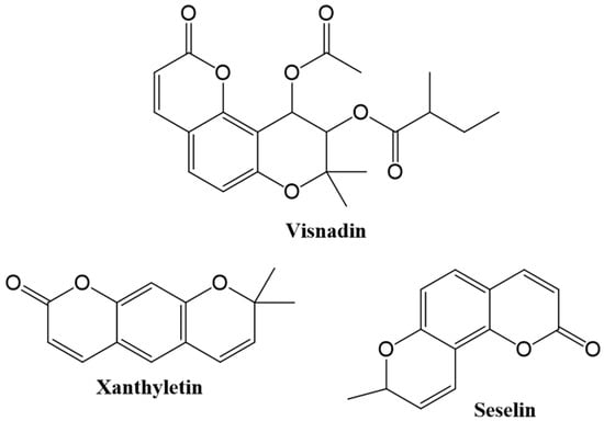 Pyranocoumarins: six-membered pyran ring is fused with the benzene ring via C6-7 (linear) or C7–8 (angular) (e.g., visnadin, xanthyletin and seselin) (Figure 3) [,].