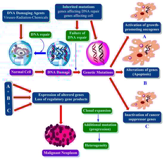 Since the division and growth of cells are controlled by genes, cancer is basically a disease associated with genes. The genes on the chromosomes are tightly packed, and physical or chemical changes on these genes can directly affect the cell’s function. Although DNA repair systems can ameliorate the function of the gene in case of damage, they cannot be always successful. In this case, inadequate or incorrect production of proteins as the products of genes leads to the disruption in cellular functions. Another factor that affects the function of the gene is epigenetic modifications, such as methylation, acetylation, phosphorylation and ribosylation, which change the function of the gene without changing its structure. These modifications can only act on a specific site, but also, they may cause of regional deletions, insertions or inversions that affect all or a large part of the chromosomes [,,].