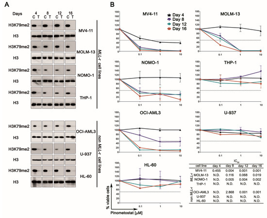 First, we tested the efficiency of 1 µM Pinometostat in inhibiting DOT1L methyltransferase activity, confirming that such a concentration, chosen so as not to exceed those used in vivo [16], caused the expected biological response, leading to the almost complete loss of H3K79me2 expression (Figure 1A). Since H3K79me2 loss impacts cell viability because of its involvement in regulating gene expression, we then examined the effect of Pinometostat on cell proliferation through flow cytometry to evaluate viable cell numbers (Figure 1B). As reported elsewhere, DOT1L inhibition impacted cell growth in the presence of MLL-r in a dose- and time-dependent manner. As expected, MV4-11, MOLM-13, and NOMO-1 cell lines, carrying MLL-AF4 or MLL-AF9 fusions, showed a dramatic decrease in cell number, with IC50 values below 1 µM following 8 days of treatment. In contrast, proliferation of U-937 or HL-60 cells, both lacking MLL-r, was unaffected by Pinometostat. Surprisingly, DOT1L inhibition had no effect on MLL-AF9-positive THP-1 cells, whereas it significantly decreased proliferation of the non-MLL-r OCI-AML3 cell line. These results demonstrate that the impact of DOT1L inhibition on cell proliferation is not strictly dependent on MLL fusions and suggest that additional factors could affect Pinometostat sensitivity.