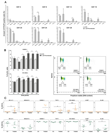Impact of Pinometostat treatment on apoptosis, cell cycle, and differentiation. MLL-r and non-MLL-r human AML cell lines were treated with 1 µM of Pinometostat or DMSO 0.01% for up to 28 days and analyzed every 4 days. (A) Flow cytometry analysis of apoptosis measured by Annexin V-FITC/PI staining. Results of three independent replicates are presented as means ± SD. (B) Increase in G0/G1 phase cells in Pinometostat-sensitive NOMO-1 and OCI-AML3 cell lines, as measured by flow cytometry (left panels), and representative dot plots showing G0/G1 cell cycle phase increase at two time points (day 8 and 16, right panels). Cell cycle analyses were performed every 4 days for a period of 20 days (D0–D20). Results of two independent replicates are presented as means ± SD. (C) Modulation of CD14 (upper panels) and CD11b (lower panels) myeloid surface markers in AML cell lines. CD14 and CD11b were analyzed by flow cytometry every 4 days for a period of 28 days, and markers’ expression in Pinometostat-treated AML cell lines was compared to that of control cells. Ctr: control cells (DMSO 0.01%). Asterisks indicate levels of significance (* p ≤ 0.05, ** p ≤ 0.01, *** p ≤ 0.001).