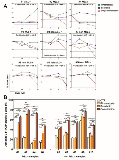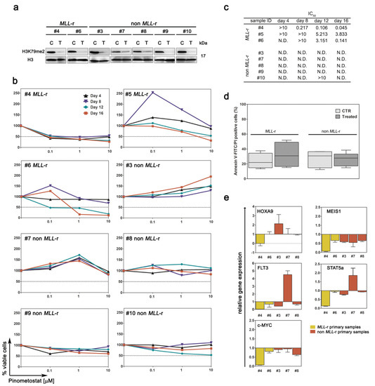We next aimed to determine Pinometostat activity in a clinically relevant context by analyzing ex vivo primary AML cells isolated from pediatric patients with or without MLL-r. To assess DOT1L inhibition, global levels of H3K79me2 were evaluated following exposure to Pinometostat (Figure 3A). Next, the sensitivity of primary AML cells to Pinometostat was investigated. As expected, none of the primary samples with wild type MLL exhibited a diminished proliferation. However, MLL-r primary samples were also poorly affected by the treatment, since cell growth impairment was limited to higher drug concentrations and longer exposure times (Figure 3B,C), and Pinometostat was unable to induce significant apoptosis even after 16 days of treatment (Figure 3D). These ex vivo results are in agreement with the modest efficacy of Pinometostat as a single agent, as observed in clinical studies on MLL-r leukemic patients [16]. In primary AML samples in which treatment with Pinometostat resulted in cell growth yielding sufficient RNA or protein, we also analyzed the impact of DOT1L inhibition on FLT3, PI3K/Akt, and MEK/ERK pathways by means of RT-PCR and immunoblotting. Similar to AML cell lines, treatment with Pinometostat affected gene expression irrespective of MLL-r. Indeed, HOXA9 gene down-modulation was detected in one of the two analyzed MLL-r primary samples, whereas MEIS1 mRNA levels decreased in all primary samples (Figure 3E). Conversely, a very poor impact on FLT3, PI3K/Akt, and MEK/ERK pathways was observed (Figure S6). Overall, these results demonstrate the limited efficacy of Pinometostat as a single agent in primary AML pediatric samples in spite of the presence of MLL-r.