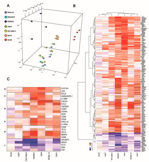 Global gene expression profiling in MLL-r and non-MLL-r human AML cell lines treated with Pinometostat. All AML cell lines were treated with 1 µM Pinometostat or DMSO 0.01% for 8 days, because in previous analyses, this drug exposure time significantly impacted proliferation, differentiation, and transcription processes. (A) Principal component analysis (PCA) plot of gene expression data. Two replicates for each cell line and condition are shown. C1: control cells, replicate 1; T1: treated cells, replicate 1; C2: control cells, replicate 2; T2: treated cells, replicate 2. (B) Heatmap and hierarchical clustering of fold changes in gene expression in response to Pinometostat for the 171 genes concordantly up- or down-regulated in at least three out of seven AML cell lines. The dendrogram clusters genes based on MLL-r. Genes involved in sustaining cancer cells or in hematopoietic cell differentiation are indicated with dots and are detailed in (C) (group a: up-regulated genes only in MLL-r cells; group b: up-regulated genes shared between MLL-r and non-MLL-r cells; group c: down-regulated genes shared between MLL-r and non-MLL-r cells). The color scale reflects the fold change in gene expression in response to Pinometostat, ranging from down-regulated (blue) to up-regulated (red).